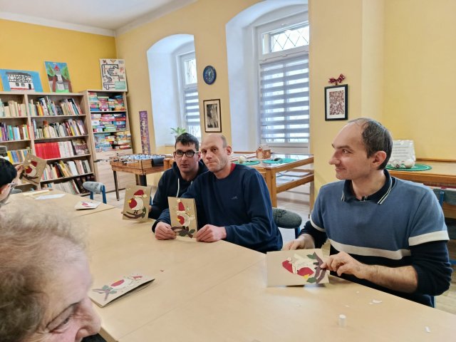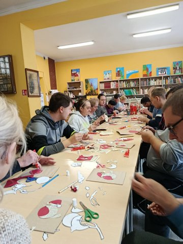 Uczestnicy Środowiskowego Domu Samopomocy w Paczkowie wzięli udział dzisiaj, 2 grudnia 2025 roku o godz. 11:00, w przygotowanych przez bibliotekę warsztatach tworzenia kartek świątecznych i z chęcią prezentowali swoje dzieła. ? Bo kto nie lubi świątecznej atmosfery?? ?