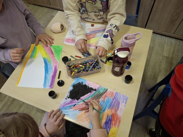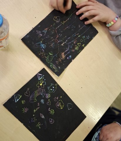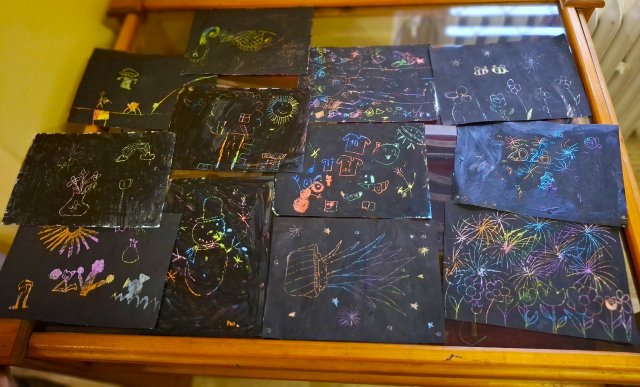 Wystarczy czarna farba, dużo kolorów kredek świecowych, czyste kartki, patyczki i drużyna chętna do pracy! I do dzieła! Tysiące pytań, gwar jak w ulu, pełno kredek pod krzesełkami, farbki po łokcie i skupione buzie dzieci - dział dziecięcy w godz. 10:00 - 12:00 zamienia się w pracownię nie na żarty! ?Ale sama kartka gotowa do wydrapywania nie wystarczy - trzeba mieć jeszcze ciekawy, kreatywny pomysł na swoją pracę!