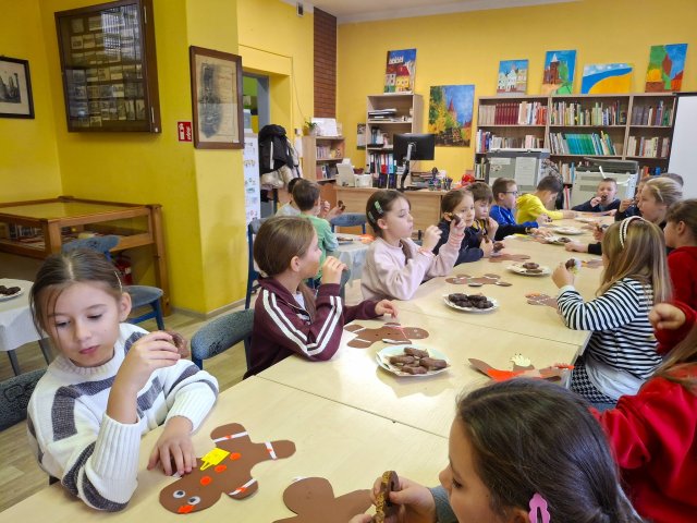 W części plastycznej dzieci wykonały przeróżne papierowe pierniki do dekoracji biblioteki - piernikowe ludziki, domki, bałwanki...