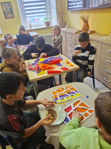 Przed drużyną łasuchów niemałe zadanie plastyczne - witrażowy lampion! W pracowni artystyczny nieład (czytaj: bałagan?), gwar i przede wszystkim dobry nastrój! A po ciężkiej pracy, jak to zawsze bywa, przyjemności - pyszny chlebek z Nutellą! Słodki poczęstunek to nie tylko celebrowanie dzisiejszego pysznego święta, ale i nagroda za piękne (i baaaardzo pracochłonne) prace. ? ? ?