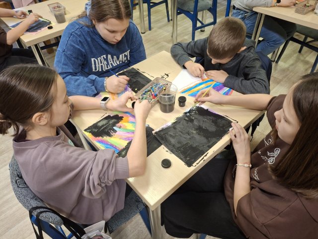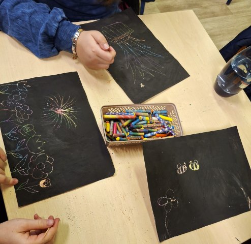 Wystarczy czarna farba, dużo kolorów kredek świecowych, czyste kartki, patyczki i drużyna chętna do pracy! I do dzieła! Tysiące pytań, gwar jak w ulu, pełno kredek pod krzesełkami, farbki po łokcie i skupione buzie dzieci - dział dziecięcy w godz. 10:00 - 12:00 zamienia się w pracownię nie na żarty! ?Ale sama kartka gotowa do wydrapywania nie wystarczy - trzeba mieć jeszcze ciekawy, kreatywny pomysł na swoją pracę!